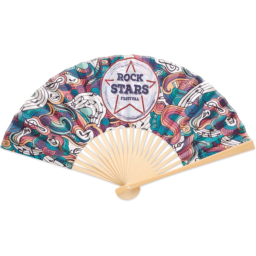 Éventail dont l'intégralité d'une face est personnalisable. Le Zaragoza est fabriqué en bambou et papier 80 grammes. L'intégralité de sa surface est personnalisable selon vos souhaits par impression photo. Téléchargez le template d'impression et créez votre éventail personnalisé vraiment unique dès aujourd'hui !