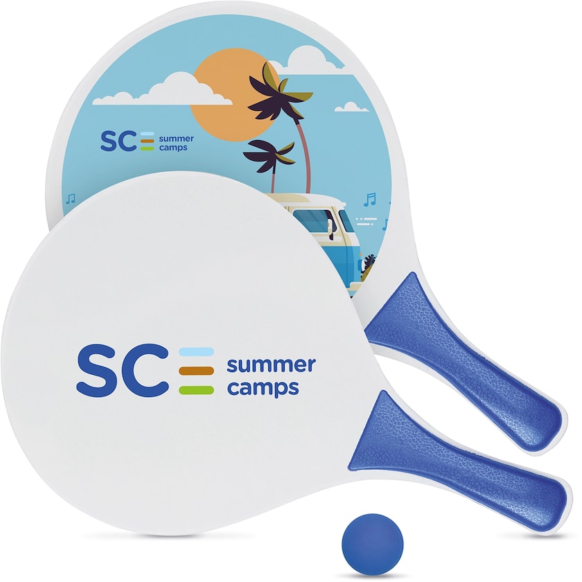 Set de tennis de plage personnalisable par impression photo en quadrichromie. Grâce à cette technique de personnalisation, vous pouvez imprimer des motifs à la fois grands et complexes. Le coût d'impression fait référence à la personnalisation de l'une des raquettes. C'est le cadeau estival parfait !