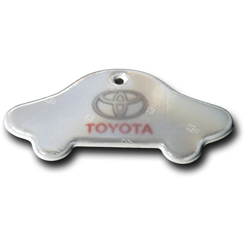 Catadioptre en forme de voiture. Un catadioptre parfait pour les firmes de taxi ou les concessionnaires auto. Livré soit avec cordon et épingle de sûreté, soit avec chaînette boule en métal. Le matériau réfléchissant répond aux exigences de la directive EN1335:2001. Pour ne pas impacter ses qualités réfléchissantes, l'imprimé doit être apposé sous la surface réfléchissante.
