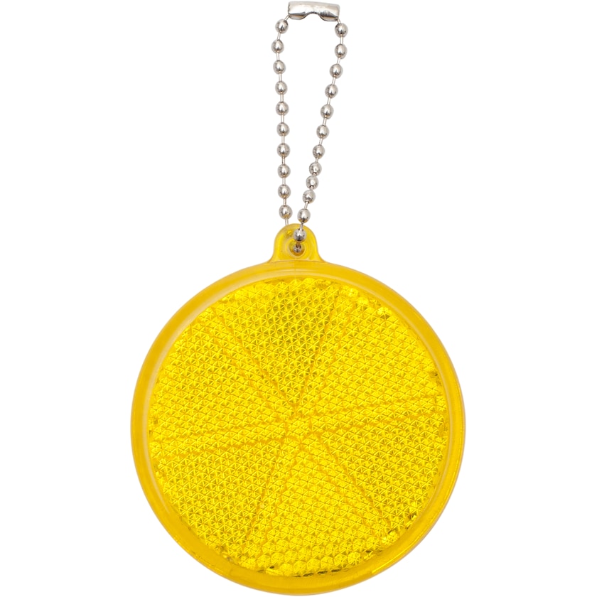 Catadioptre rond avec chaînette en métal. Accrochez-le au sac à dos ou à la veste. Un produit publicitaire pour grands comme petits!