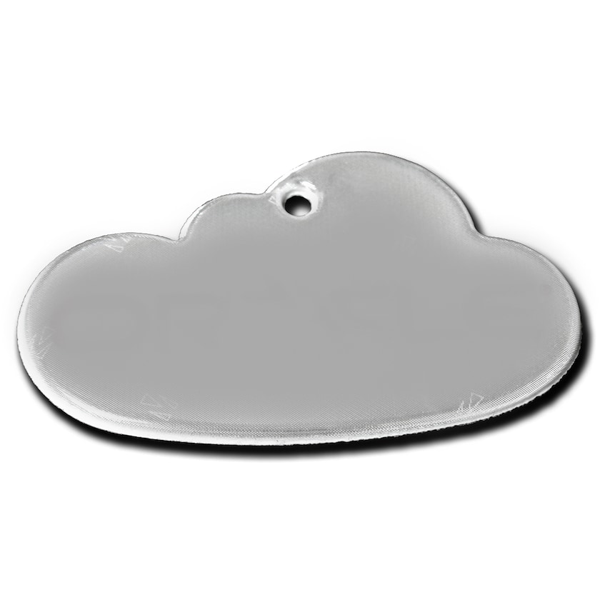 Catadioptre en forme de nuage. Le catadioptre est livré soit avec cordon et épingle de sûreté, soit avec chaînette boule en métal. Le matériau réfléchissant répond aux exigences de la directive EN1335:2001. Pour ne pas impacter ses qualités réfléchissantes, l'imprimé doit être apposé sous la surface réfléchissante.