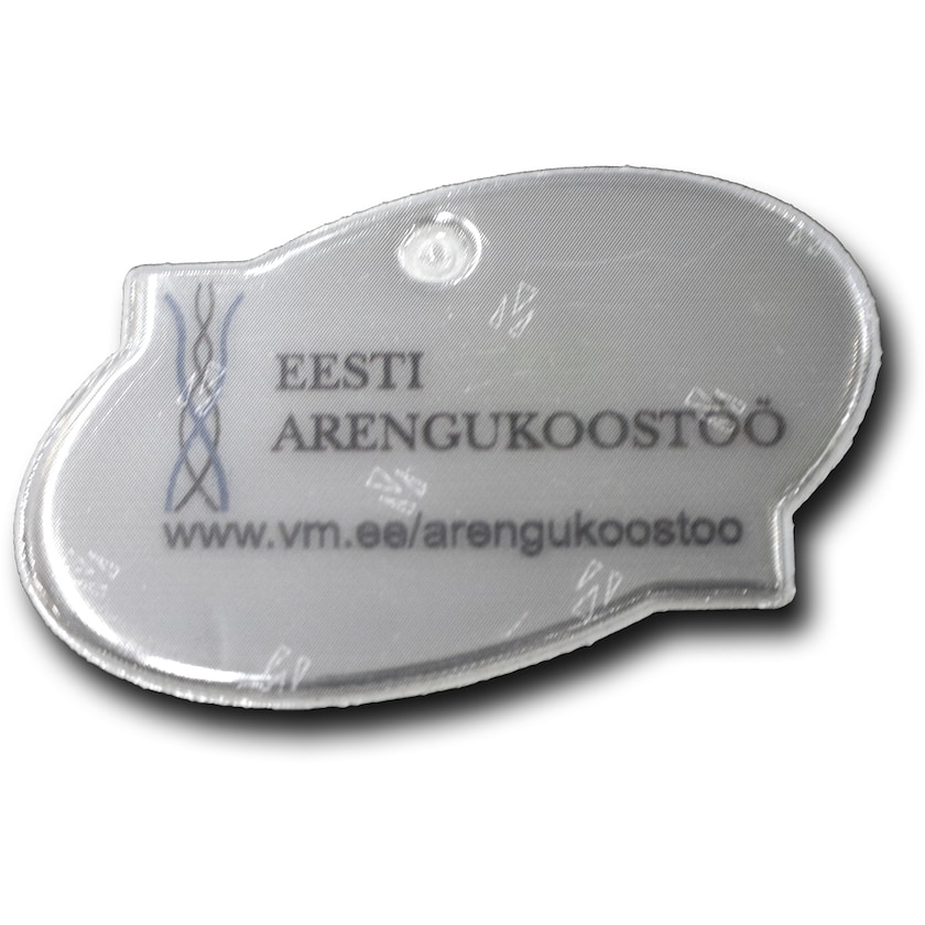 Catadioptre conçu comme une bulle de dialogue. Livré soit avec cordon et épingle de sûreté, soit avec chaînette et boule en métal. Le matériau réfléchissant vient de 3M Scotchlite et répond aux exigences EN1335:2001. Pour ne pas impacter ses qualités réfléchissantes, son impression doit être apposé sous la surface réfléchissante.