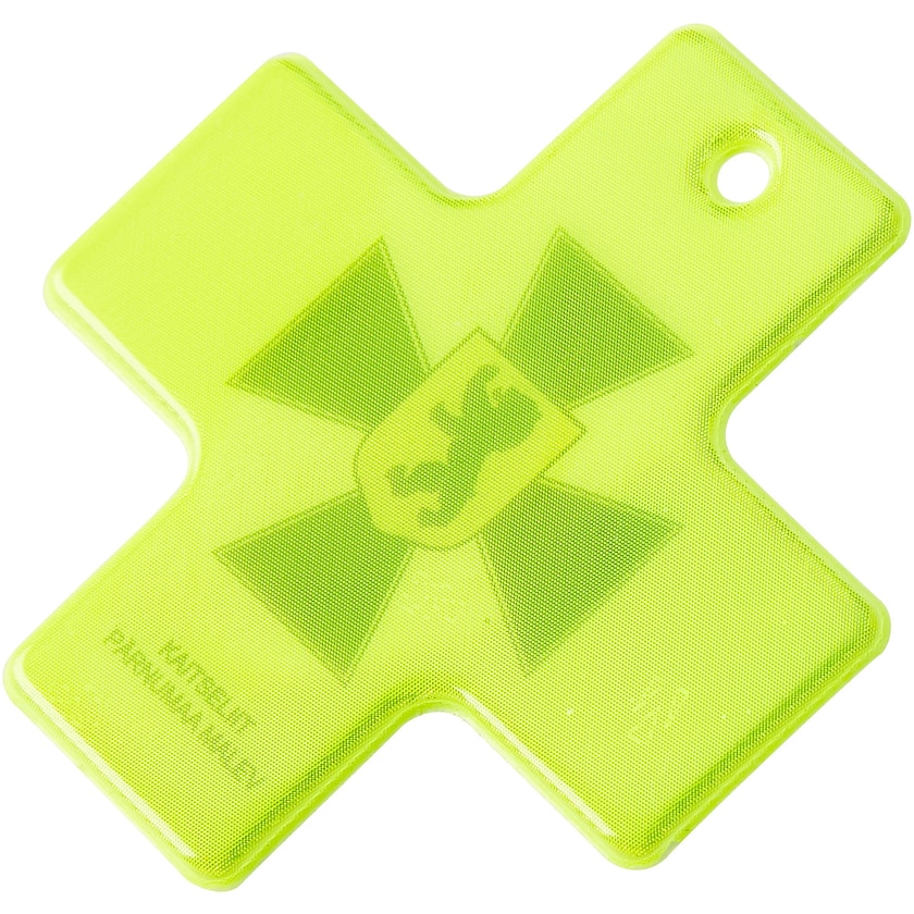 Catadioptre souple en forme de croix. Le catadioptre est livré soit avec cordon et épingle de sûreté, soit avec chaînette boule en métal. Le matériau réfléchissant répond aux exigences de la directive EN1335:2001 et est disponible en blanc ou en jaune. Pour ne pas impacter ses qualités réfléchissantes, l'imprimé doit toujours être apposé sous la surface réfléchissante.