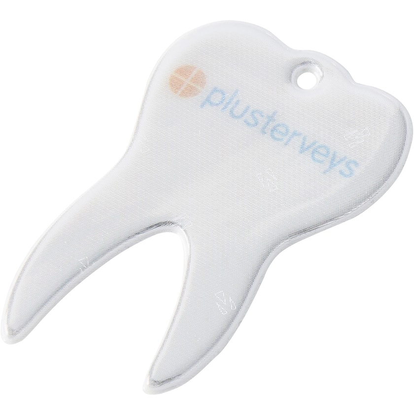 Catadioptre souple en forme de dent. Parfait pour des dentistes! Livré soit avec cordon et épingle de sûreté, soit avec chaînette boule en métal. Le matériau réfléchissant répond aux exigences de la directive EN1335:2001. Pour ne pas impacter ses qualités réfléchissantes, l'imprimé doit être apposé sous la surface réfléchissante.
