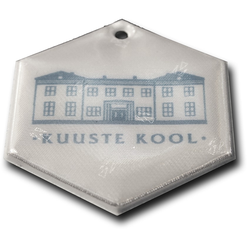 Catadioptre souple hexagonal en matériau réfléchissant de première qualité. Livré soit avec cordon et épingle de sûreté, soit avec chaînette boule en métal. Le matériau réfléchissant répond aux exigences de la directive EN1335:2001. Pour ne pas impacter ses qualités réfléchissantes, l'imprimé est apposé sous la surface réfléchissante.