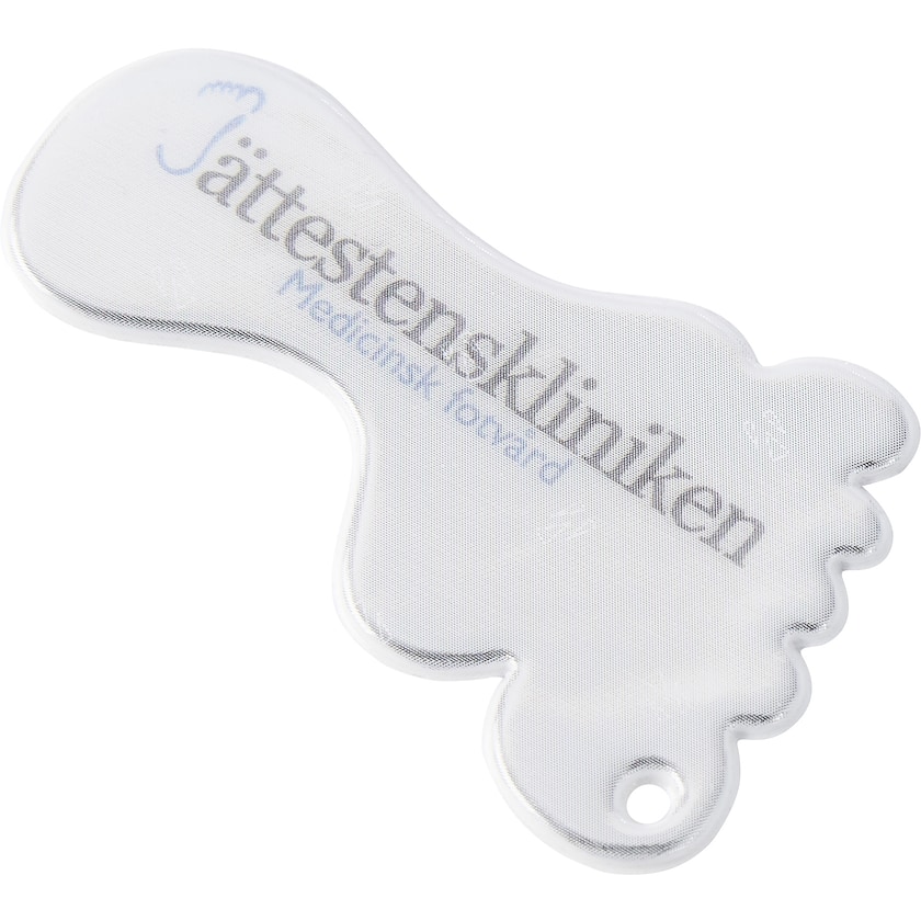 Catadioptre en forme de pied. Idéal pour les entreprises de soins des pieds et de podologie, par exemple. Livré soit avec cordon et épingle de sûreté, soit avec chaînette boule en métal. Le matériau réfléchissant répond aux exigences de la directive EN1335:2001. Pour ne pas impacter ses qualités réfléchissantes, l'imprimé doit être apposé sous la surface réfléchissante.