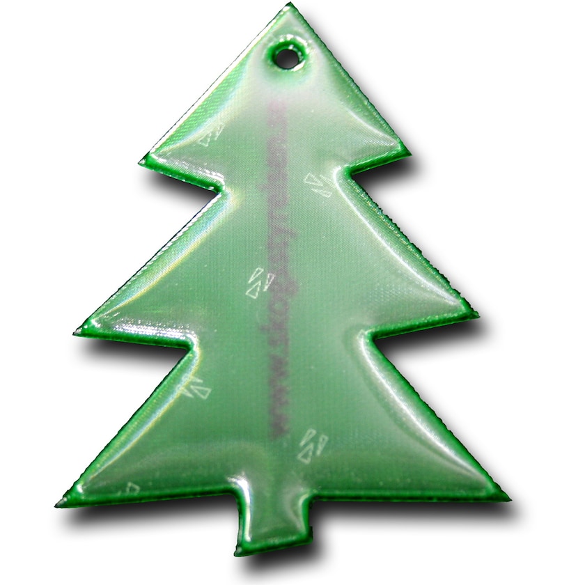 Joli catadioptre souple en forme de sapin. Livré soit avec cordon et épingle de sûreté, soit avec chaînette boule en métal. Le matériau réfléchissant vient de 3M Scotchlite et répond aux exigences de la directive EN1335:2001. Pour ne pas impacter ses qualités réfléchissantes, l'imprimé doit être apposé sous la surface réfléchissante.