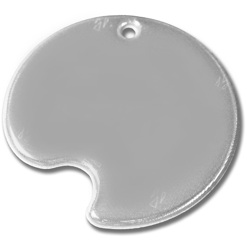 Catadioptre souple fun en forme de palette de peinture. Livré soit avec cordon et épingle de sûreté, soit avec chaînette boule en métal. Le matériau réfléchissant répond aux exigences de la directive EN1335:2001. Pour ne pas impacter ses qualités réfléchissantes, l'imprimé doit être apposé sous la surface réfléchissante.