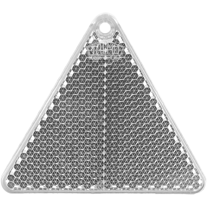 Disque réfléchissant triangulaire en plastique dur. L'étiquette réfléchissante est fabriquée en Europe et répond aux exigences de la norme CE EN 17353:2020 B1. Elle est fournie avec une ficelle et une épingle de sûreté ou une attache à rotule.