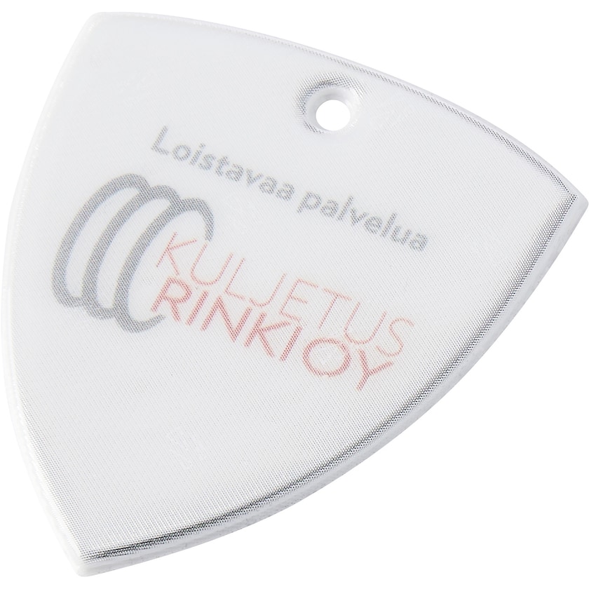 Catadioptre souple en forme d'écusson. Livré soit avec cordon et épingle de sûreté, soit avec chaînette boule en métal. Le matériau réfléchissant vient de 3M Scotchlite et répond aux exigences de la directive EN1335:2001. Pour ne pas impacter ses qualités réfléchissantes, l'imprimé est apposé sous la surface réfléchissante.