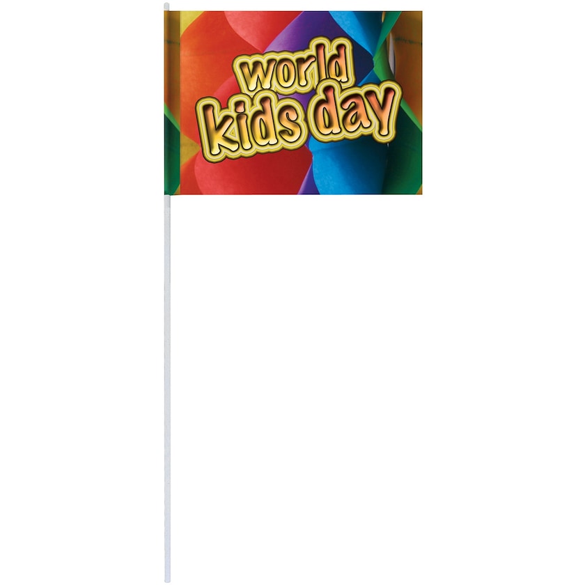 Grand drapeau en papier avec imprimés personnalisés. Le drapeau est fabriqué en papier offset stratifié mat de 135 g/m², collé sur un bâton en plastique écologique de 50 cm de long. Le bâton est fabriqué à 70% en matériaux recyclés. Le drapeau est imprimé des deux côtés, chaque côté pouvant avoir un imprimé propre. Livrés en groupes de 25 dans des boîtes de 1000.