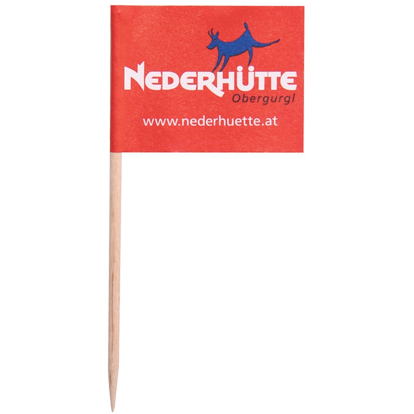 Drapeaux de cocktail personnalisés. Les drapeaux de cocktail sont fabriqués en papier offset sans bois, et collés sur un cure-dent en bois d'environ 80 mm de long. Les drapeaux sont imprimés des deux côtés, chaque côté pouvant avoir un motif propre. Commandés par 1000.