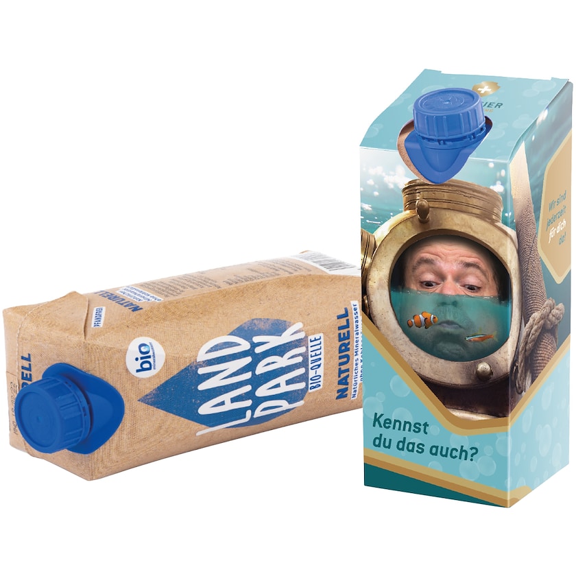 Eau minérale Landmark avec manchon en carton personnalisé. L'eau minérale possède une faible teneur en sodium et est mise en bouteille directement à la source. La boîte est fabriquée dans du papier certifié FSC et est personnalisée suivant un processus climatiquement neutre. La boîte originale est recyclable, avec un texte en allemand.