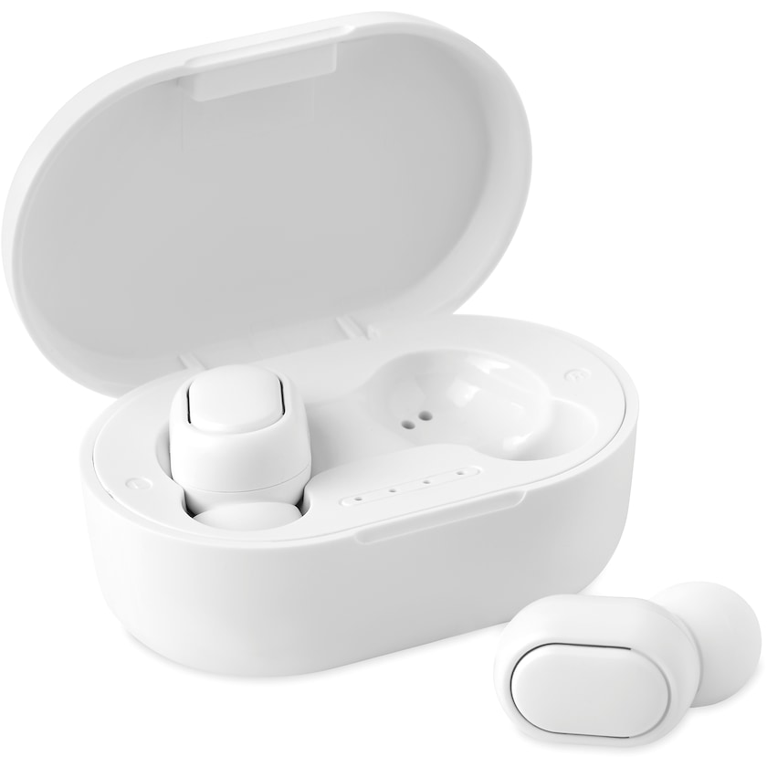 Écouteurs sans fil en plastique ABS recyclé. Les écouteurs sont de type True Wireless Stereo 5.0, avec une batterie intégrée permettant une autonomie d'environ 4 heures. L'étui de rangement sert également de station de recharge. Câble micro-USB inclus.