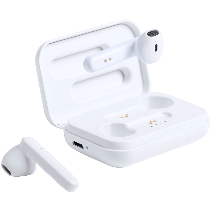 Écouteurs sans fil dans un étui de rangement. Les écouteurs se rechargent dans l'étui de rangement. Câble d'alimentation USB inclus.