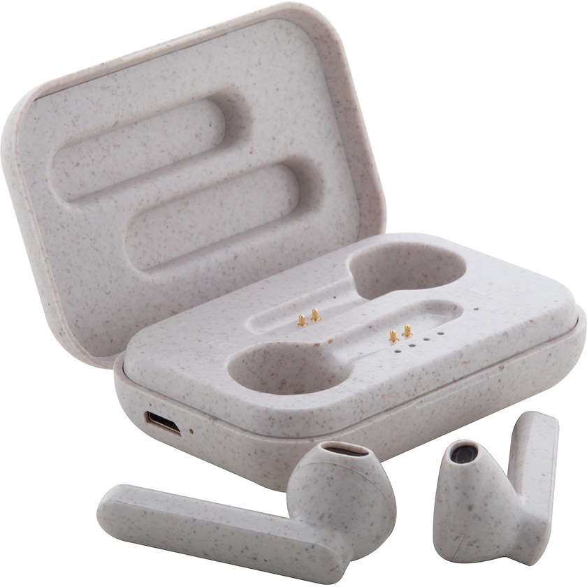 Écouteurs sans fil écologiques avec impression. Higginsport est fabriqué à partir de paille de blé biologique. Câble de recharge USB inclus. Livré dans une boîte en carton de couleur naturelle.