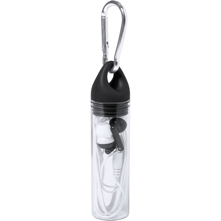 Écouteurs in-ear dans un tube de rangement avec mousqueton. Les écouteurs ont une prise 3,5 mm. L'impression est effectuée sur le tube de rangement. L'impression est réalisée en deux couleurs maximum.