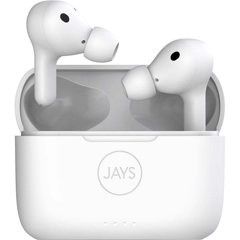 Écouteurs intra-auriculaires Jays de première classe. Les écouteurs proposent un son fantastique et la réduction du bruit extérieur. Leur autonomie est de 5 heures. Les écouteurs sont de plus équipés d'un excellent microphone, et intègrent le contrôle vocal via Siri ou Google Assistant. Trois embouts différents en caoutchouc sont inclus pour un confort optimal. Les écouteurs peuvent être rechargés sans fil ou via le câble inclus dans la boîte. La personnalisation est réalisée sur la boîte.
