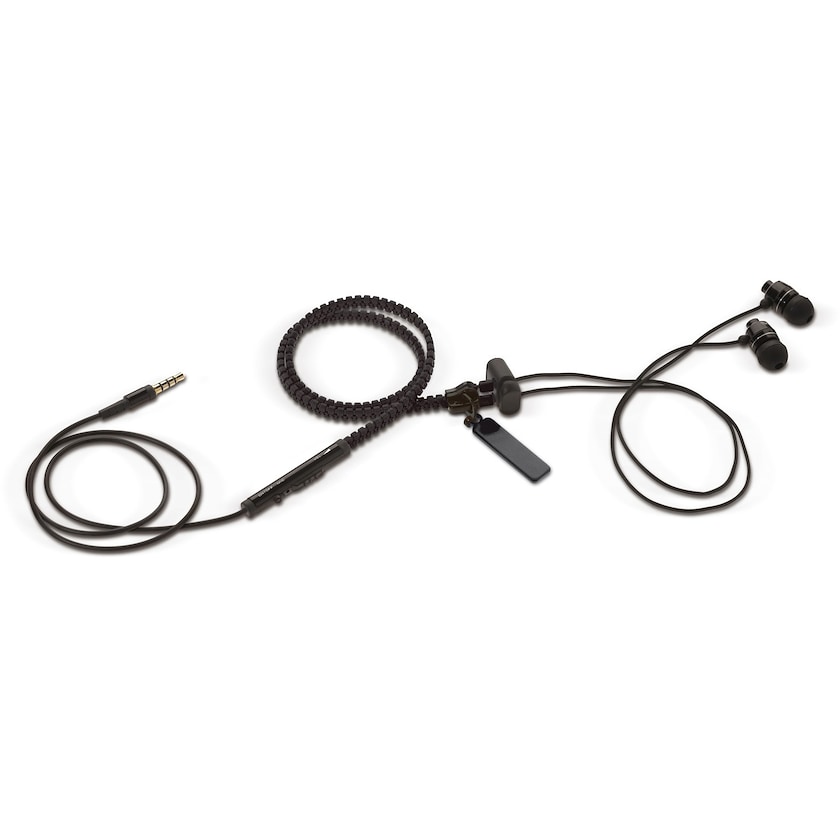 Écouteurs in-ear avec microphone équipés d'une fermeture éclair qui raccourcit les câbles. La fermeture éclair minimise le risque que les câbles s'emmêlent. La personnalisation est effectuée sur la fermeture éclair. Livrés dans un sachet de rangement en microfibres.