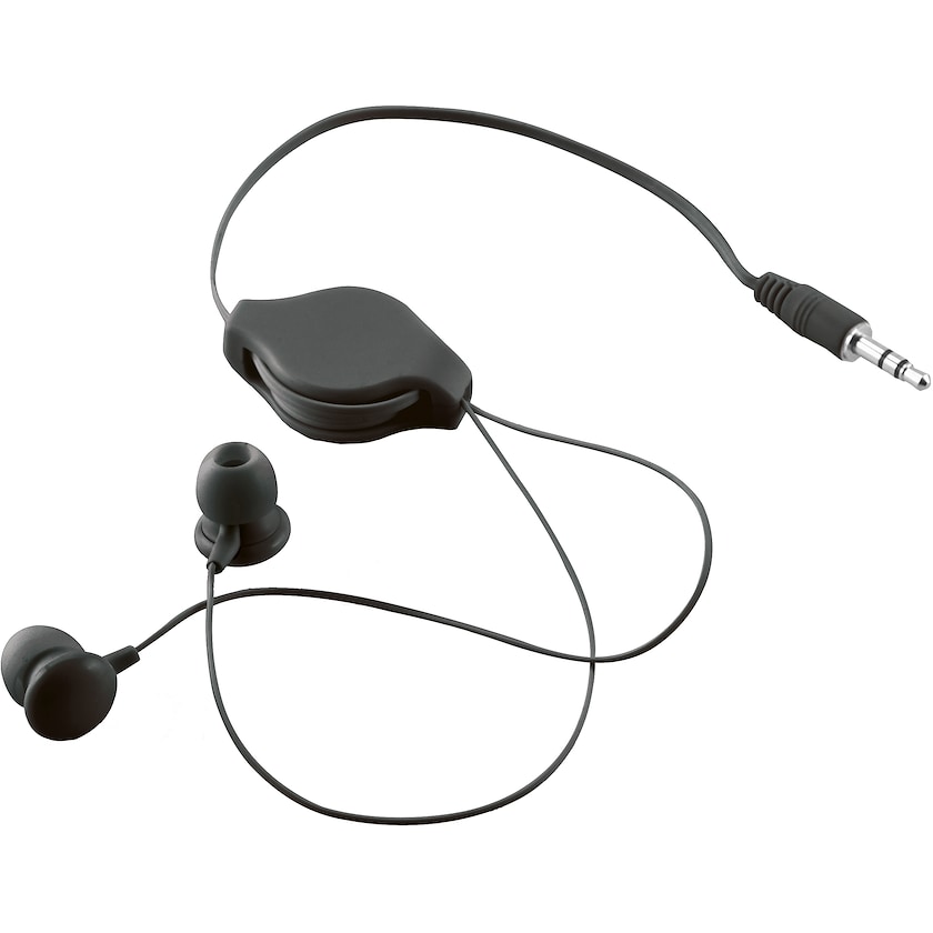 Écouteurs in-ear enroulables.. Les écouteurs sont livrés dans un étui noir non tissé.
