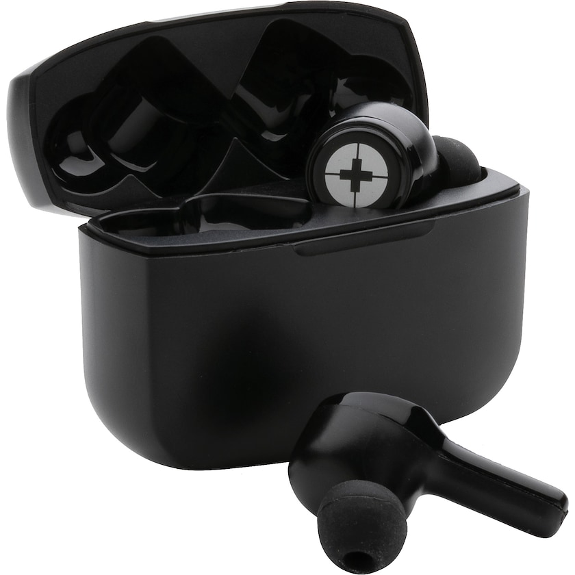 Écouteurs haut de gamme Swiss Peak. Les écouteurs et le boîtier de recharge sont en ABT recyclé. Les écouteurs intègrent la technologie BT 5.3 qui garantit un appairage automatique et une connexion stable. L'autonomie de jeu est de 3,5 heures, avec une portée de 10 mètres.