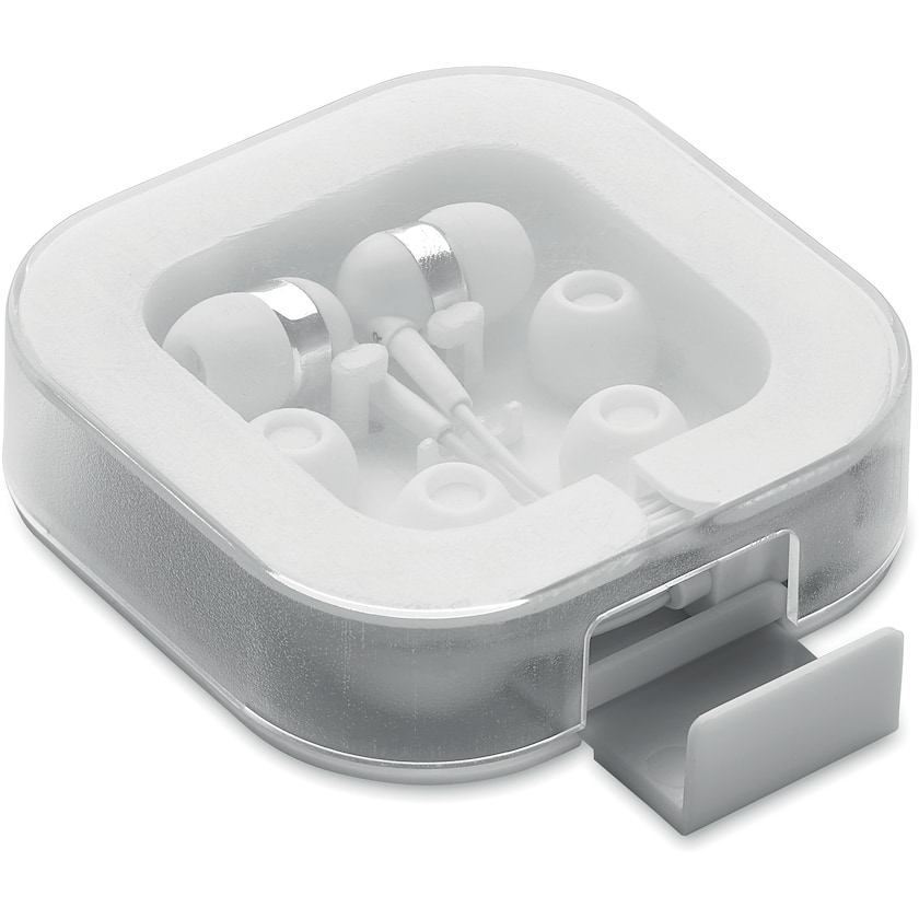 Ecouteurs avec étui et support mobile. Le câble mesure 120 cm de long. Des housses en silicone supplémentaires en trois tailles différentes sont incluses.