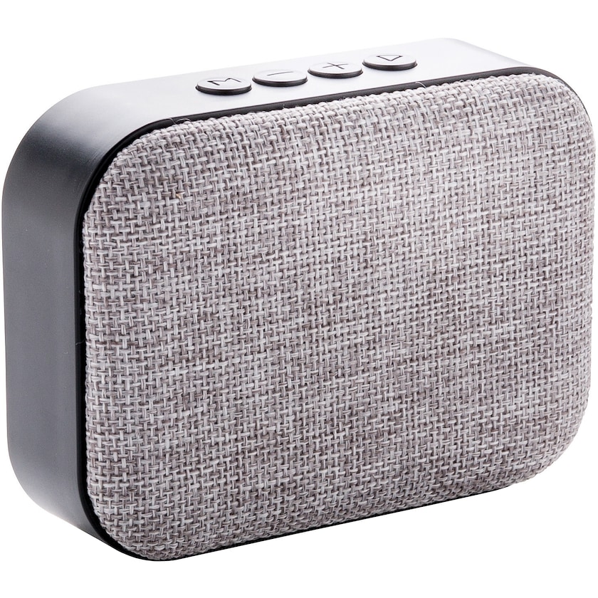 Enceinte Bluetooth moderne avec le devant en tissu gris. La batterie peut supporter jusqu'à 3 heures d'autonomie de jeu sur une charge, et une distance de réception de jusqu'à 10 mètres. Microphone et câble audio inclus. L'imprimé est effectué sur le tissu du devant de l'enceinte.