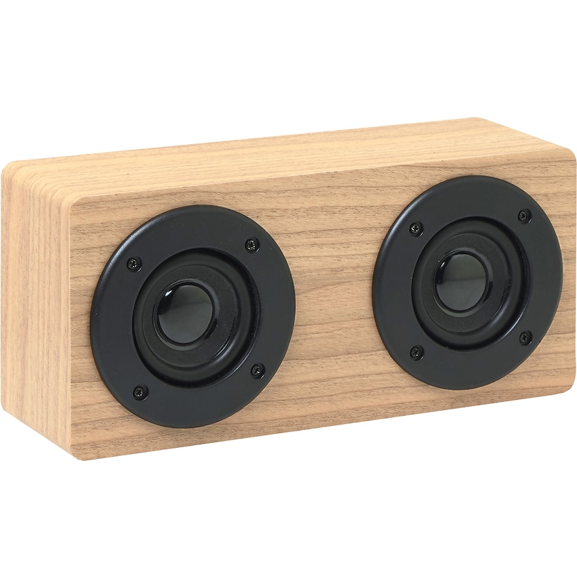 Enceinte Bluetooth avec deux haut-parleurs et amplificateur intégré. La coque extérieure de l'enceinte est en bois. La personnalisation est effectuée par impression ou gravure laser dans le bois.