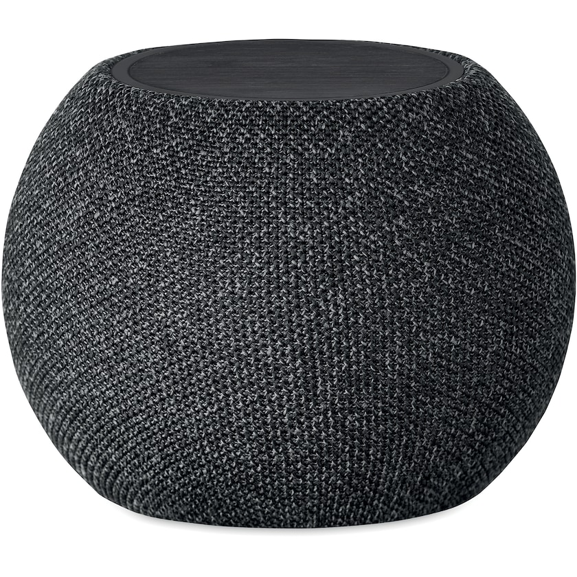 Haut-parleur sans fil 5.0 combiné et chargement sans fil. Fabriquée en ABS, RPET et bambou laqué noir. Alimentée par une batterie Li-ION rechargeable de 1200 mAh. Carte SD et câble AUX-USB inclus. 5 heures d'autonomie. L'étiquette se trouve sur le dessus de l'enceinte.