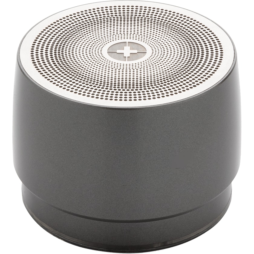 Enceinte sans fil Swiss Peak. L'enceinte est en métal avec sub-woofer intégré pour une basse renforcée. L'autonomie de jeu est de 5 heures. Grâce à la technologie BT 5.0, elle s'appaire facilement avec votre téléphone portable. La distance maximale d'appairage est de 10 mètres.