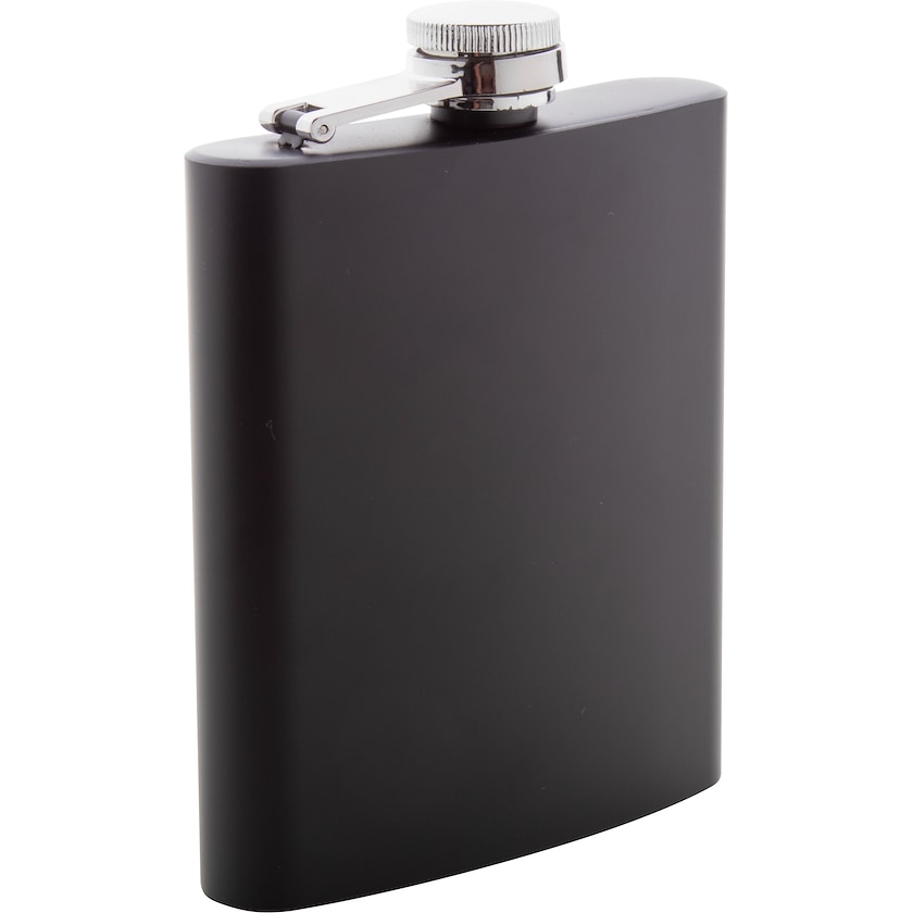 Flasque de poche noire en acier inoxydable. La Frederick peut contenir 20 cl, ce qui est largement suffisant. La personnalisation est réalisée par gravure laser.