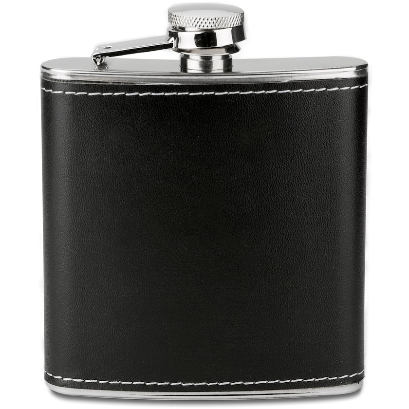 Élégante flasque de poche en métal et cuir synthétique d'une capacité de 18 cl. La personnalisation est effectuée par gravure laser sur la surface en cuir synthétique.