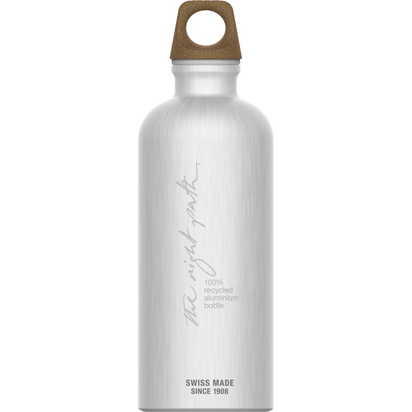 Bouteille d'eau de Sigg en aluminium 100 % recyclé. La bouteille est totalement neutre en dioxyde de carbone et le bouchon est fait d'un matériau renouvelable qui ne consomme pas les ressources de la terre. Fabriqué en Suisse. Observez le texte préimprimé sur la bouteille.