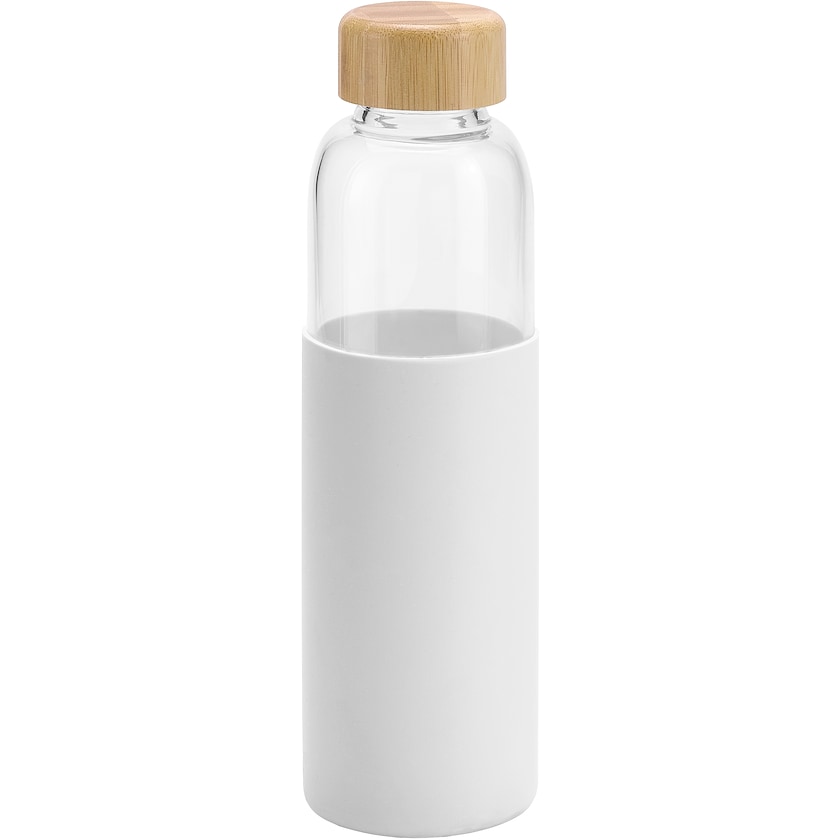 Gourde en verre avec zone de préhension en silicone. Le bouchon est fabriqué en bambou. Le verre est ignifugé et très résistant. Livrée dans un emballage individuel en carton. L'impression est réalisée sur le verre, la gravure laser sur le bouchon.