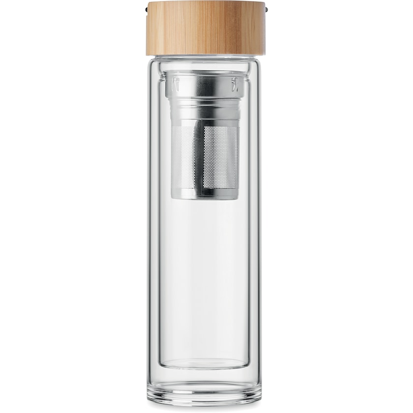 Gourde en verre borosilicaté avec infuseur à thé. Le verre borosilicaté rend la gourde très résistante. Le bouchon est en bambou. La gourde est à paroi double, ce qui lui permet de garder les boissons chaudes longtemps. En cas d'impression monochrome, la surface de personnalisation est de pas moins de 180 x 110 mm.