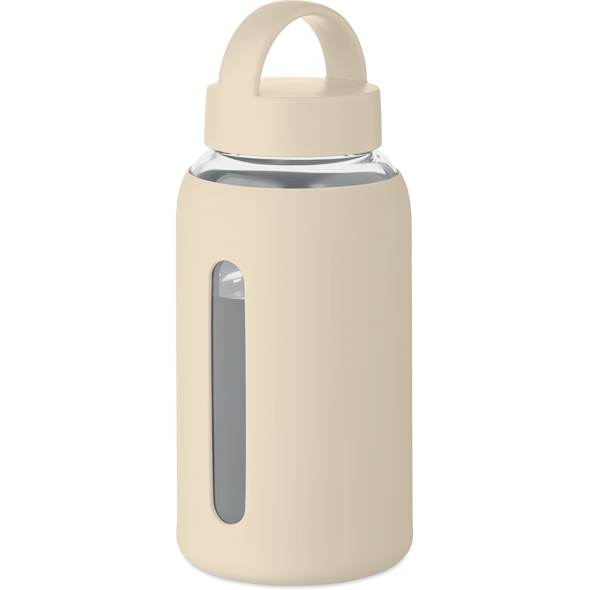 Bouteille d'eau en verre avec couvercle de protection en silicone. Le couvercle est muni d'une poignée.