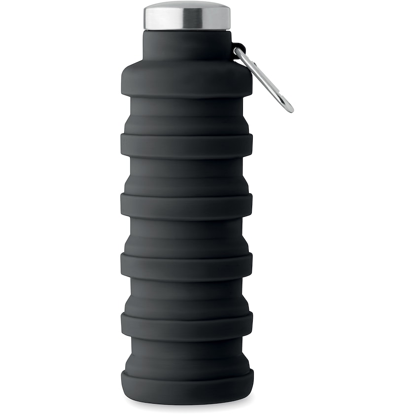 Bouteille d'eau pliable en silicone. Le couvercle est en acier inoxydable et le mousqueton en aluminium. Le marquage est réalisé par impression ou gravure laser sur le couvercle.