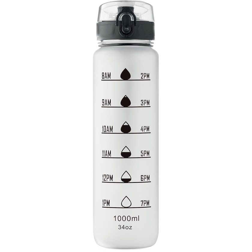 Bouteille d'eau en rPET avec marquage horaire. Le couvercle est équipé d'un verrou de sécurité et s'ouvre d'une seule main. Anti-fuite.