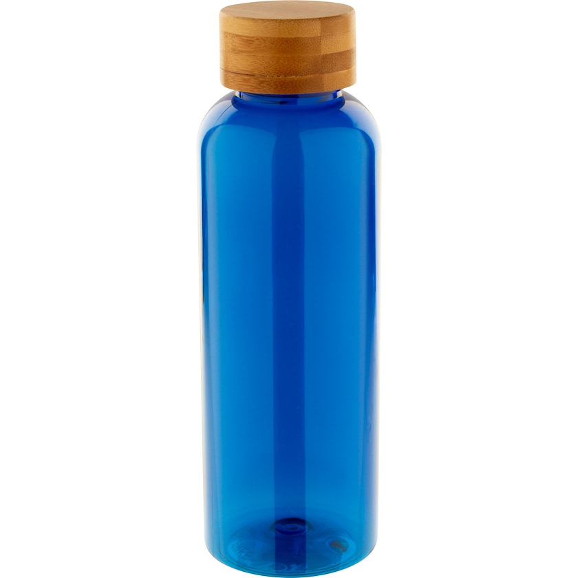 Gourde en matériau recyclé et couvercle en bambou. La gourde est en rPET, c'est-à-dire fabriquée à partir de bouteilles PET. Ne peut être utilisée pour des boissons gazeuses.