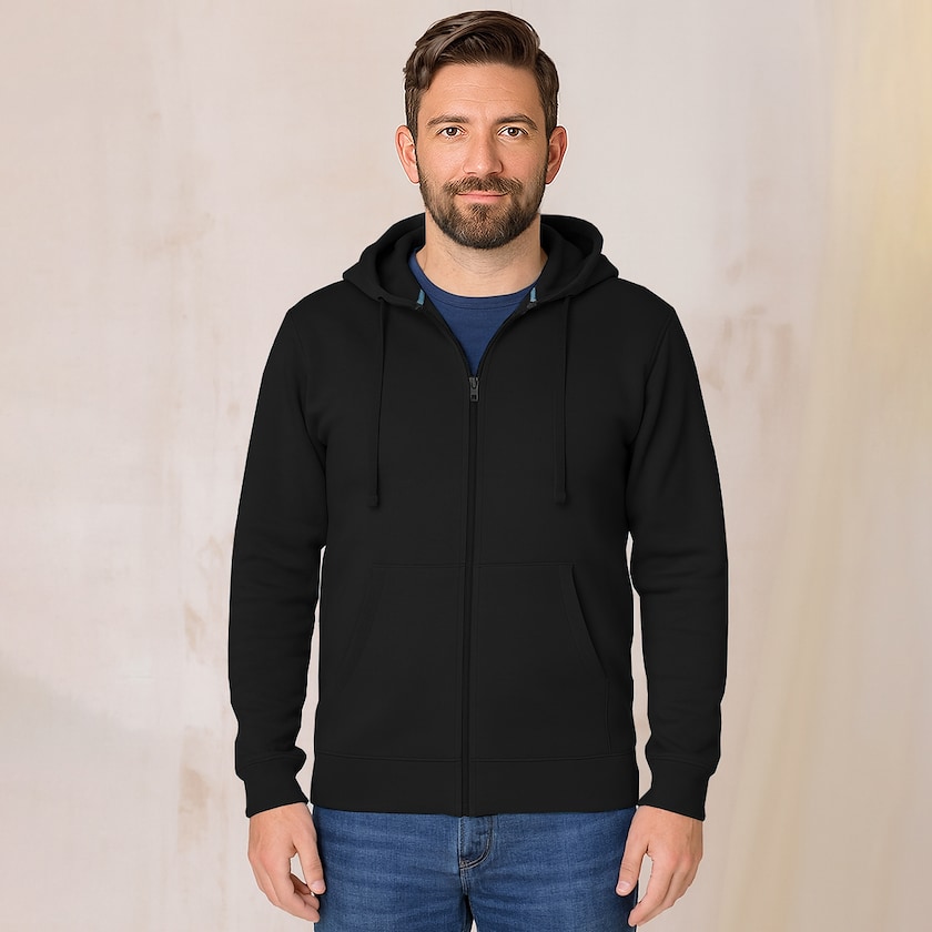 Hoodie personnalisé en matériaux écologiques durables. Le tissu est fabriqué à 80% en coton et à 20% en polyester recyclé certifié GRS.