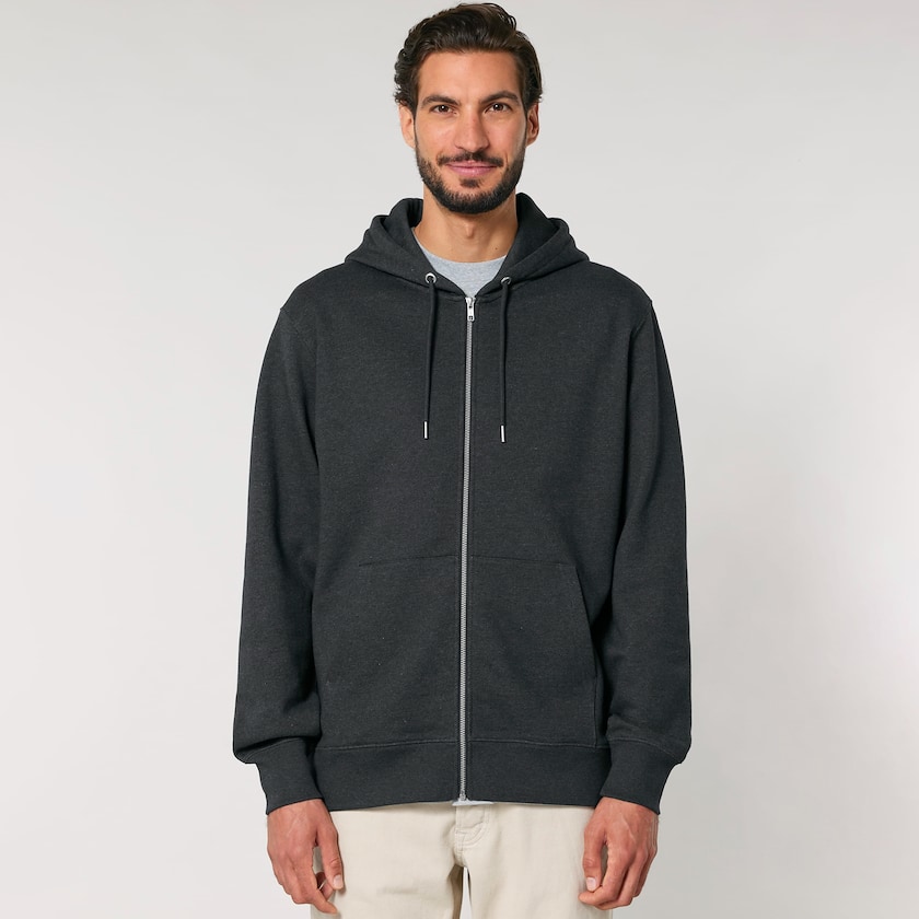 Sweat à capuche écologique pour hommes et femmes avec fermeture éclair longue. Le sweat à capuche est composé à 100 % de coton biologique.