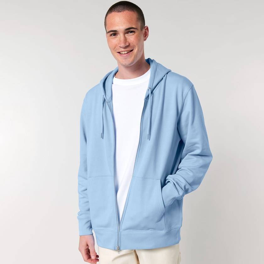 Sweat à capuche écologique pour hommes et femmes avec fermeture éclair longue. Le sweat à capuche est composé à 100 % de coton biologique.