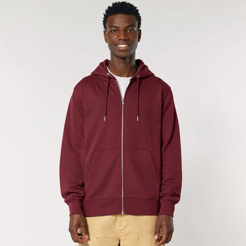 Sweat à capuche écologique pour hommes et femmes avec fermeture éclair longue. Le sweat à capuche est composé à 100 % de coton biologique.
