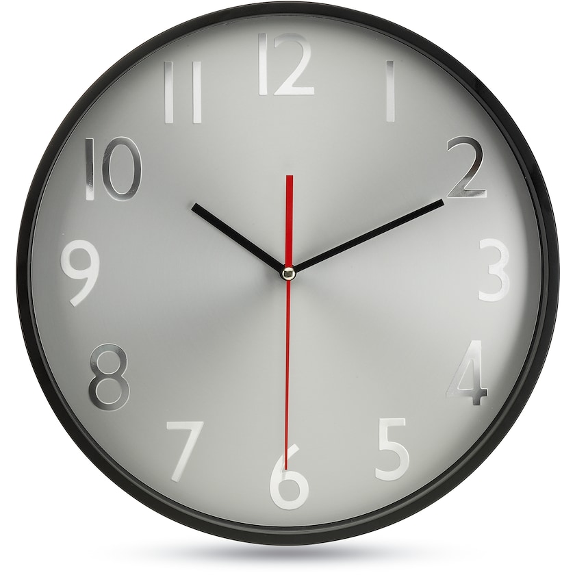 Horloge murale avec cadre argenté et bordure noire. Les chiffres sont en aluminium. Le cadran lui-même est protégé par du verre. Alimenté par une pile AA (non incluse). Uniquement avec impression 1 couleur.