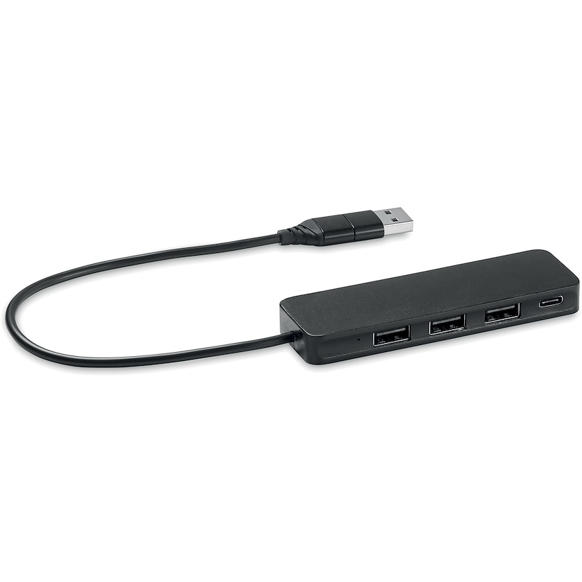 Hub USB avec quatre ports. Livré avec câble 2-en-1 de 22 cm de long.