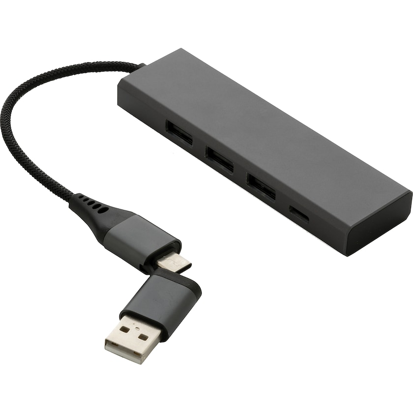 Hub USB écologique en matériau recyclé. Le Campton est fabriqué en aluminium recyclé, ABS, TPE et PET. Le hub USB intègre trois ports USB A 2.0 et un port USB C. Le câble mesure 10 cm de long. Livré dans une boîte cadeau en carton certifié FSC.