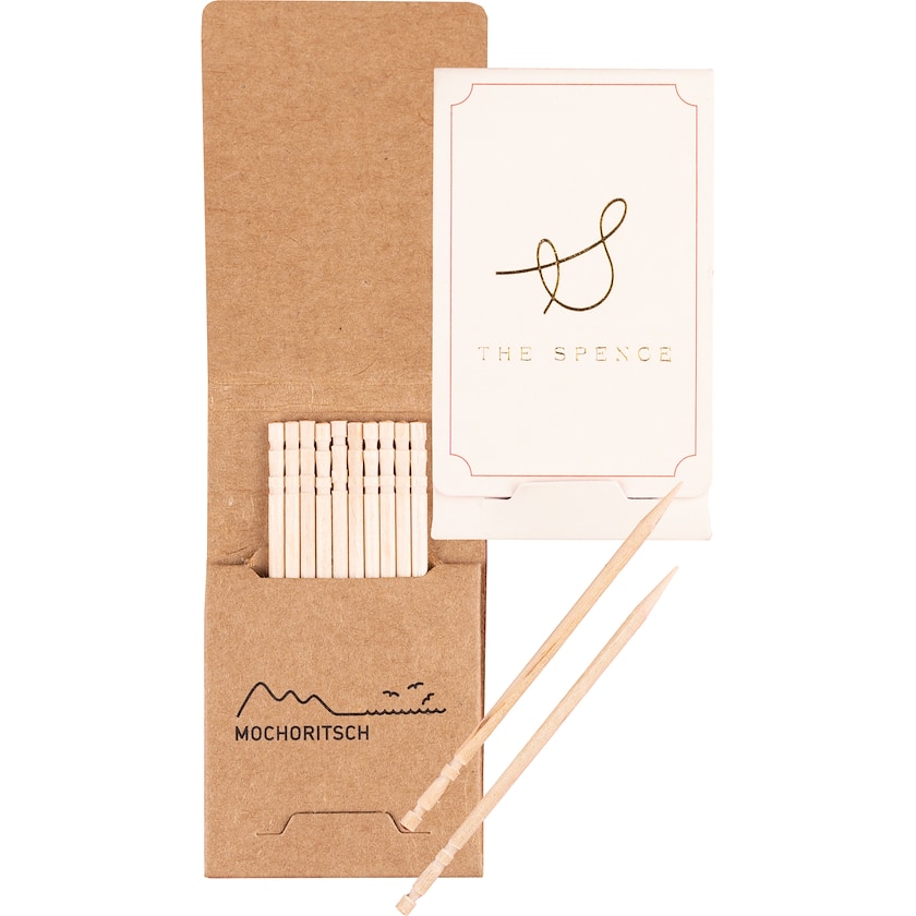 Étui en papier contenant 10 cure-dents en bois. Vous décidez vous-même de la couleur de l'impression à la fois sur les surfaces intérieures et extérieures.