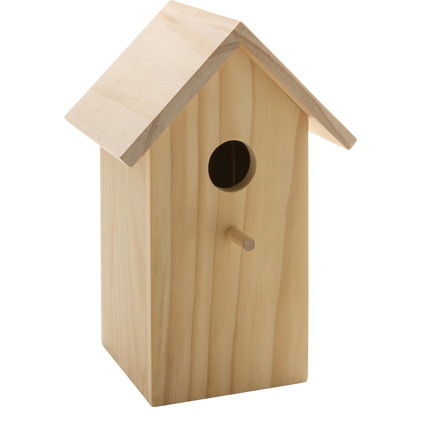 Nichoir en bois de pin certifié FSC. Le diamètre de l'ouverture est de 33 mm, idéal pour les moineaux et autres petits oiseaux. Livré dans une boîte en carton couleur nature.