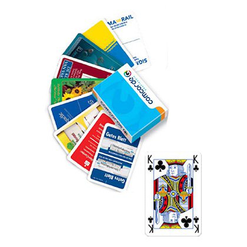 Jeu de carte avec boîte. Le jeu de carte possède une taille bridge et des figures internationales. Le message publicitaire est imprimé sur la face arrière. Livré emballé dans une boîte en papier.