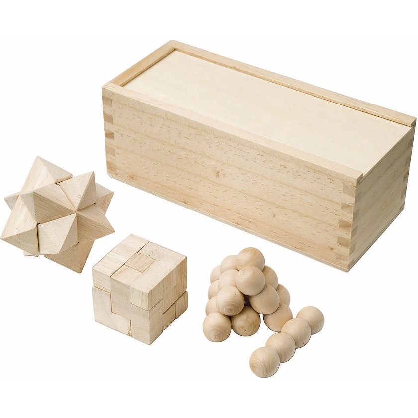 Set de trois casse-têtes stimulants qui entraînent la pensée logique. Les jeux et leur boîte de rangement sont fabriqués intégralement en bois. Un cadeau d'entreprise écologique et malin!